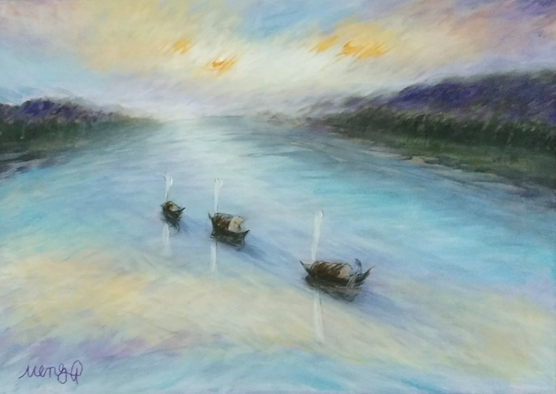 In dieser Arbeit fange ich die Lebendigkeit von Acrylfarben ein und verwende leuchtende Farben und energische Pinselstriche, um in dieser wunderschönen Heimatstadt eine Flusslandschaft zu schaffen, die Emotionen und innere Einkehr hervorruft.
